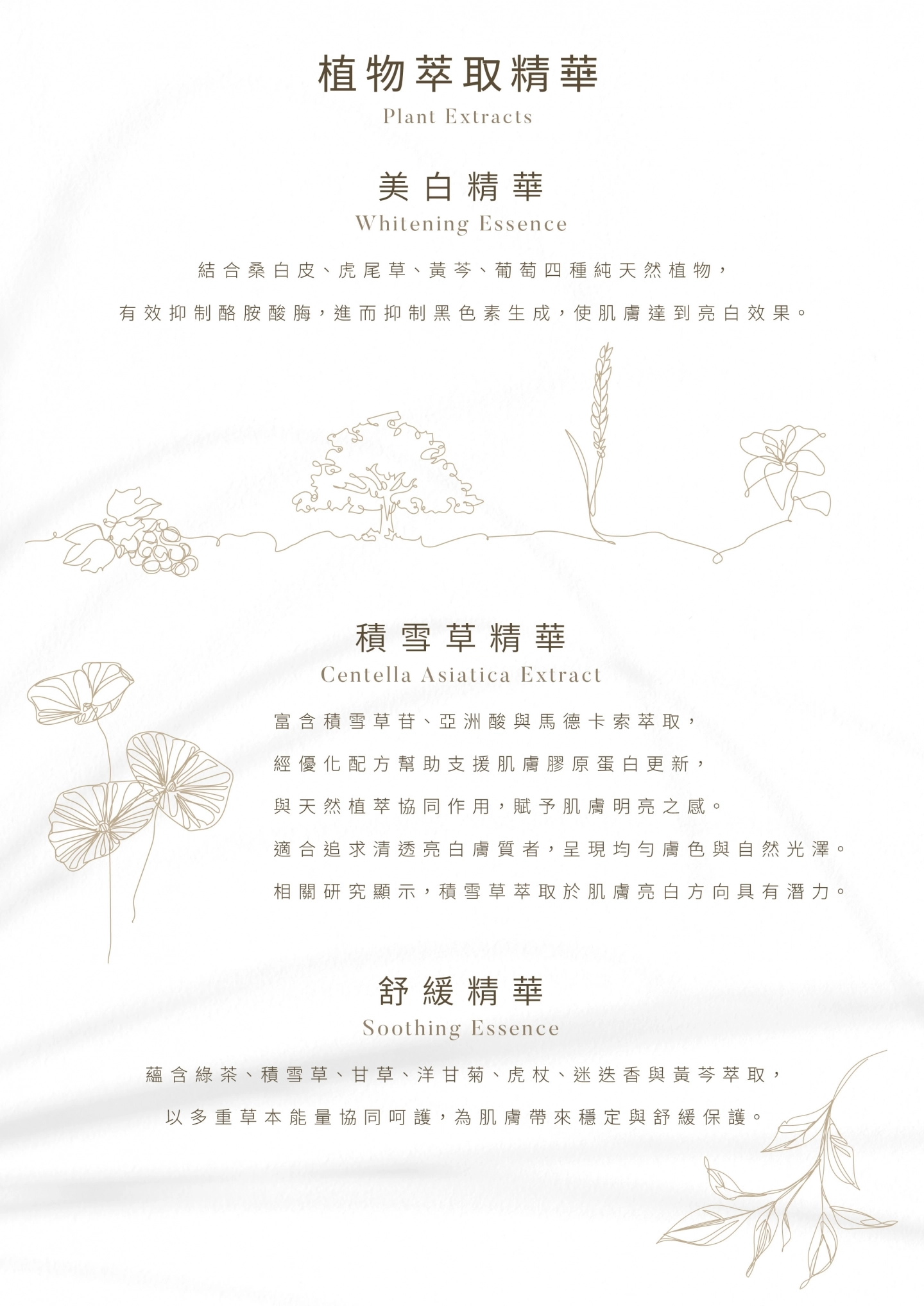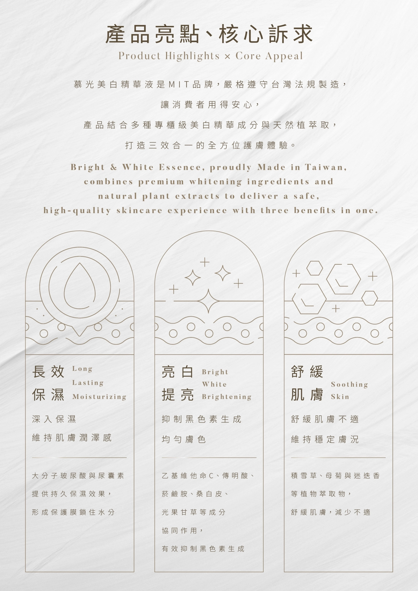 產品結合多種專櫃級美白精華成分與天然植萃取, 打造三效合一的全方位護膚體驗。