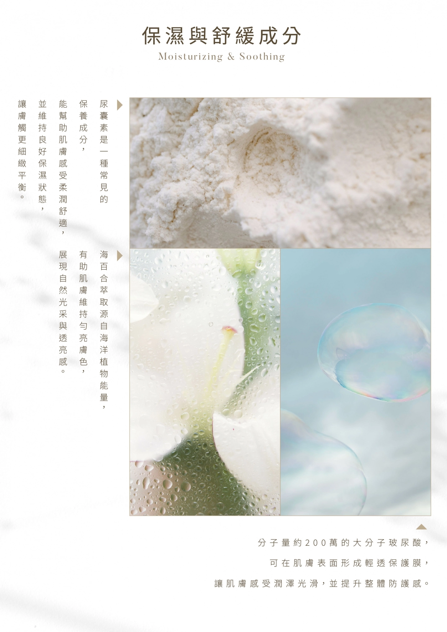 大分子玻尿酸與尿囊素提供持久保濕效果,形成保護膜鎖住水分。