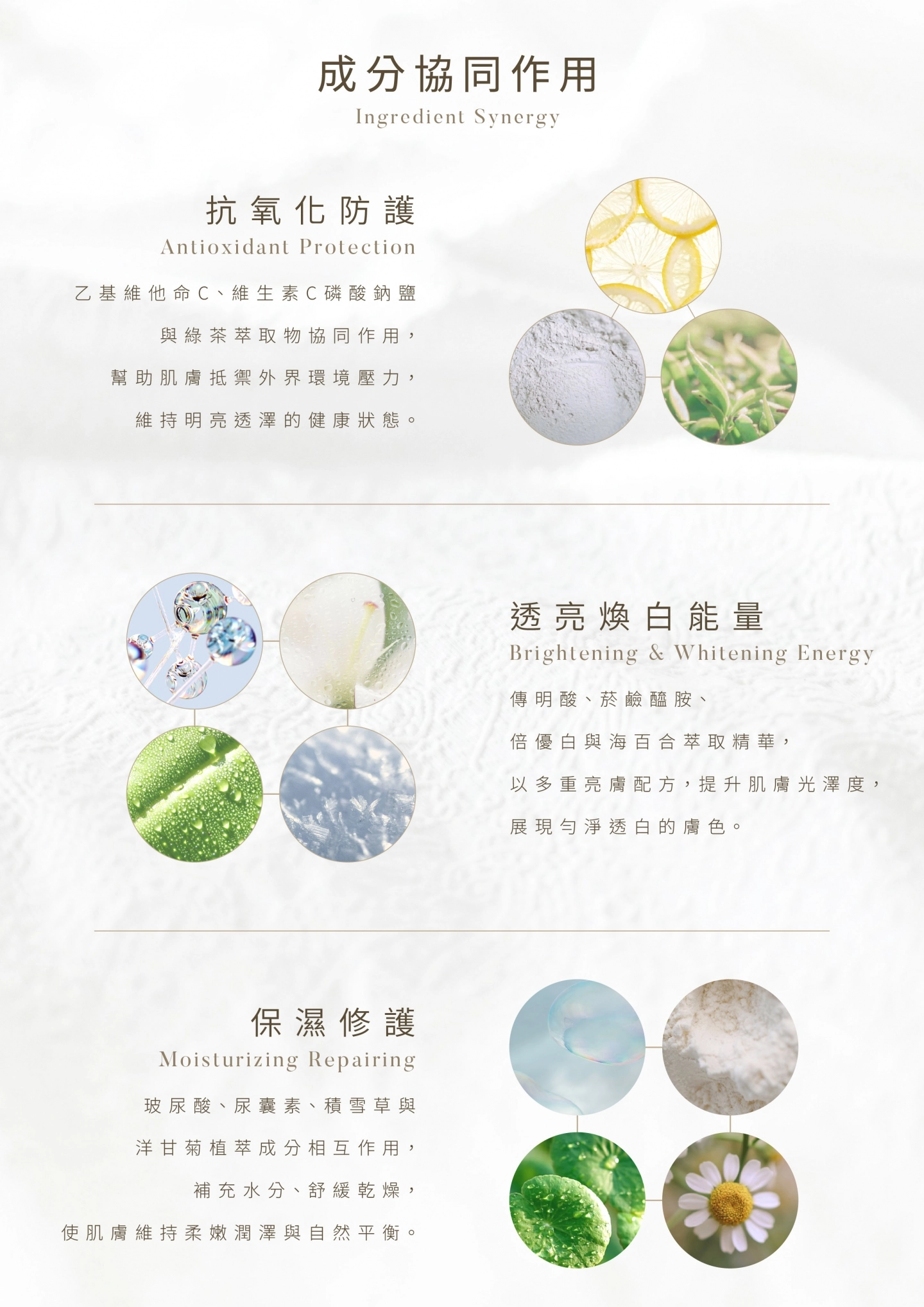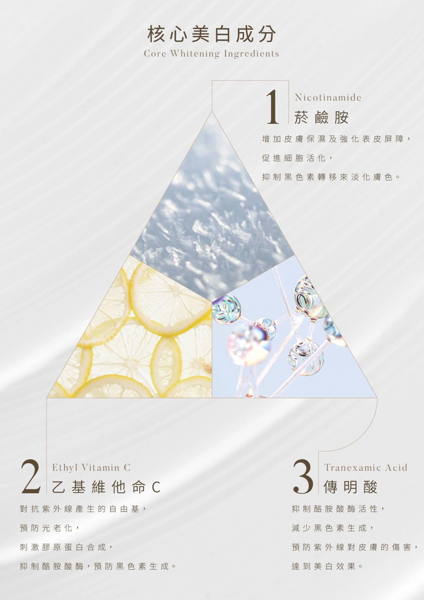 乙基維他命C、傳明酸、菸鹼胺、桑白皮、光果甘草等成分協同作用,有效抑制黑色素生成。